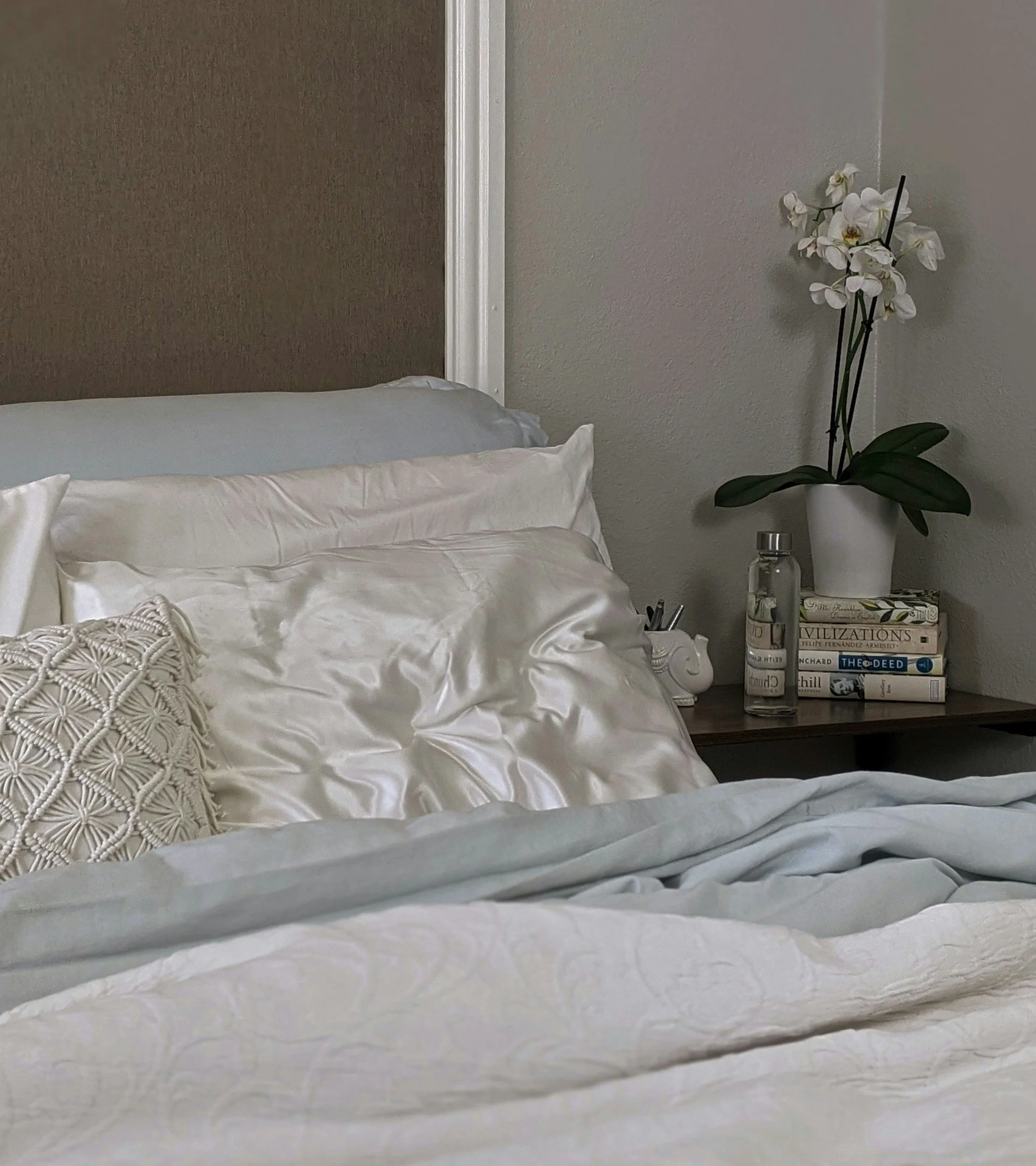 Wusstest du, dass ein großer Teil der Haarlängen durch Reibung abbricht – vor allem nachts? Baumwollkissen entziehen dem Haar Feuchtigkeit und rauen die Schuppenschicht auf. Seidenkissenbezüge und Seidenhauben schaffen hier Abhilfe.